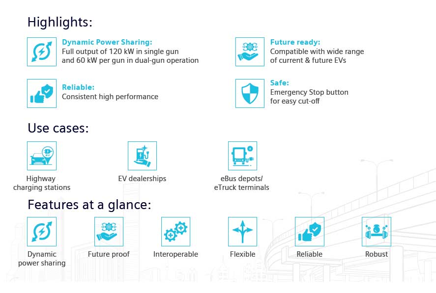 The 120 kW DC public charger comes equipped with 2 x CCS2* charging cables. It has a higher power rating, is future proof and is capable of fast charging suitable for highway charging stations, eBus & eTruck depots and terminals.