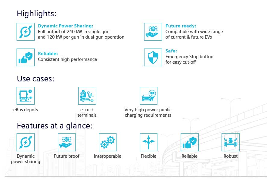 The 240 kW DC public charger comes equipped with 2 x CCS2* charging cables. It has a higher power rating, is future proof and is capable of ultrafast charging suitable for eBus & eTruck depots and terminals as well as high power public charging requirements.