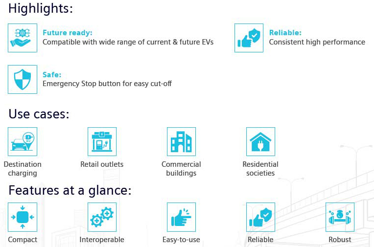The 30 kW DC Wall box charger comes equipped with a single CCS2 charging cable. Its compact shape and form as well as easy-to-understand UI makes it ideal for destination charging at retail outlets, commercial buildings and residential societies.